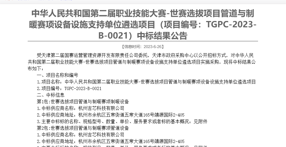 熱烈祝賀我司“職教事業部”,順利通過“中華人民共和國第二屆職業技能大賽-世賽選拔項目管道與制暖賽項設備設施支持單位”遴選,屆時,我司將全力做好賽事設備、技術保障及支持工作,預祝中華人民共和國第二屆職業技能大賽舉辦取得圓滿成功。